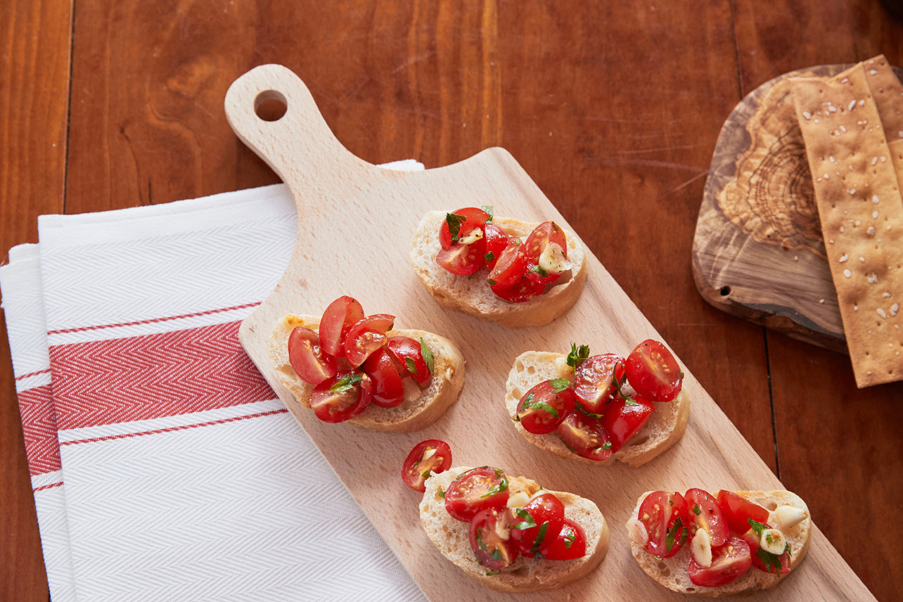 This long beechwood serving board is the perfect way to serve and display not only bruschetta, but also appetizers, antipasti, and charcuterie.